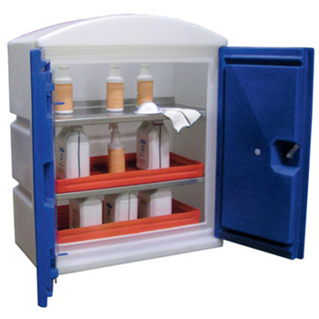 Fabriquée en 100% PEHD, avec étagères en acier inoxydable. 2 portes battantes avec fermeture à clé. Toit bombé pour éviter la stagnation d'eau. Coloris armoire beige naturel et portes bleus (proche RAL 5010).