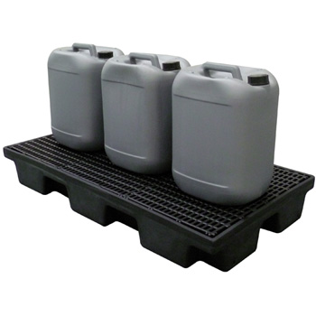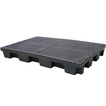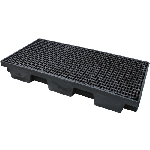 Plateforme 2480 litres : (permet la pose de 2 palettes europe 1200 x 800 mm) Dimension hors tout (L x p x h) : 1610 x 1270 x 150 mm. Dimension caillebotis (L x l) : 1580 x 1240 mm. Volume de rétention : 240 litres. Capacité de charge : 1800 kg.