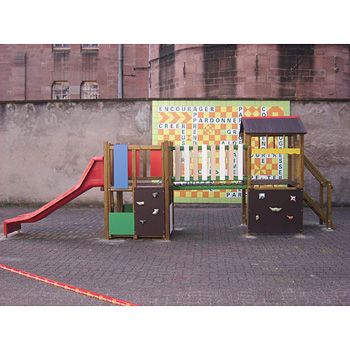 Différentes possibilités permettant de se hisser en haut, telles que le mur avec prises d'escalade ou un filet de corde, qui en font un ensemble qui enchantera les enfants.