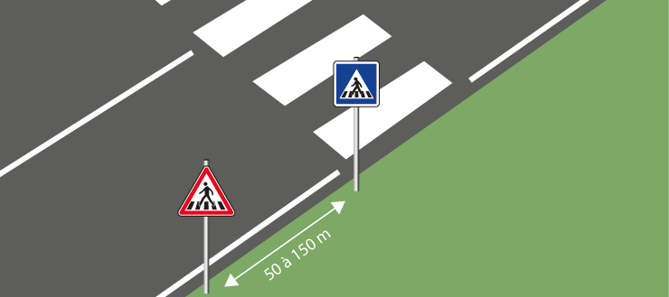 Ce panneau est situé en agglomération à une distance de 50 mètres du passage piéton et en rase campagne à une distance de 150 mètres.