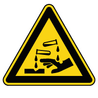 Il est codifié W023 par la norme ISO 7010. La norme prescrit la forme et la couleur du symbole. De nombreux acides et bases peuvent se montrer corrosifs en cas d'accident de manipulation, comme par exemple l'acide nitrique, l'acide phosphorique, la soude caustique...
