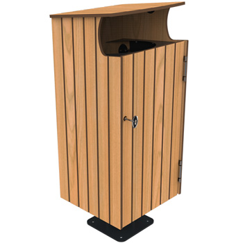 En acier traité anticorrosion et poudré anti-UV. Lames en compact HPL. Arceau support de sac avec chaine en inox.