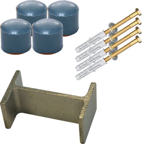 Kit d’accessoires pour l'aménagement d'un îlot de sécurité. Ce kit comprend 1 pièce de liaison métallique, 4 capuchons en caoutchouc gris et 4 tire-fond avec chevilles et rondelles.