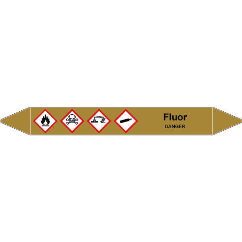 Planche ou rouleau de marqueurs de tuyauteries gaz fluor avec pictogrammes CLP indiquant une matière inflammable, très toxique pour l'homme (mortelle), corrosive et un gaz sous pression.