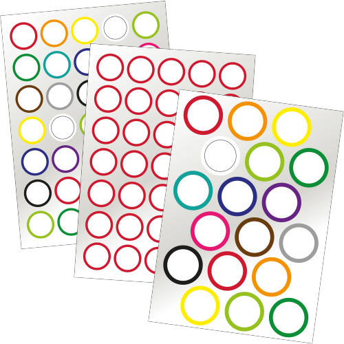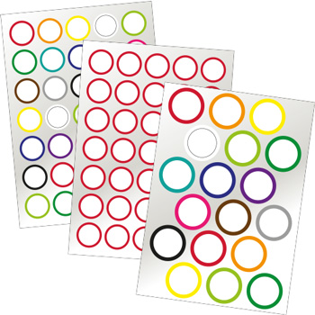 Planche de pastilles adhésives forme ronde contour couleur et intérieur blanc pour personnalisation au marqueur.