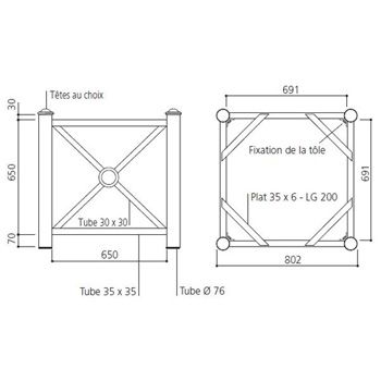 Le fond amovible est en tôle galvanisée et les panneaux latéraux amovibles sont en tôle électrozinguée laquée, fixés sur poteaux par pattes et vis à tôle.