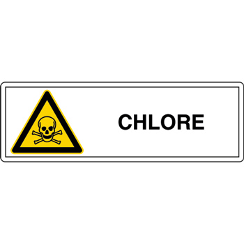 Panneau de signalétique sur les dangers liées aux bouteilles de gaz horizontal avec symbole et texte pour indiquer la présence de chlore et un risque mortel.