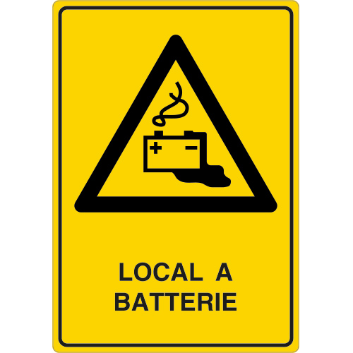 Panneau de sécurité vertical jaune et pictogramme noir, danger local à batterie. Permet de rappeler un danger lié à un stockage de batterie dans un local.