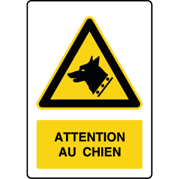 Panneau de signalétique de danger rectangulaire et vertical noir et jaune sur fond blanc pour notifier de la présence d'un chien dans la zone.