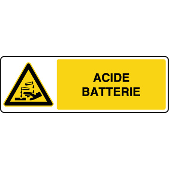 Panneau de signalétique de danger rectangulaire et horizontal noir et jaune sur fond blanc avec pictogramme W023 qui signale une substance corrosive à proximité, ici une ou plusieurs batterie(s).