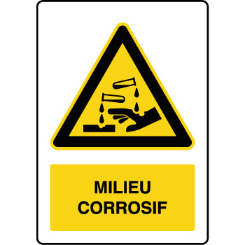 Panneau de signalétique de danger rectangulaire et vertical noir et jaune sur fond blanc avec pictogramme W023 qui représente un milieu corrrosif, et qui invite donc à la prudence.