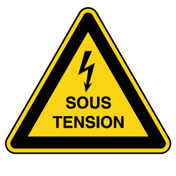 Panneau de signalétique de danger triangulaire noir sur fond jaune qui signale dans la zone un élément sous tension.