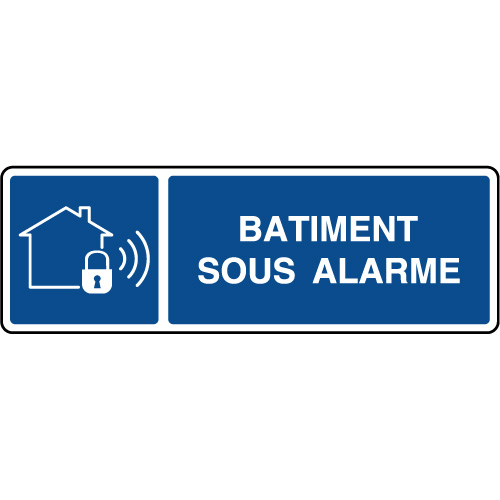 Panneau de signalétique d'information rectangulaire et horizontal blanc sur fond bleu qui prévient que le bâtiment est protégé par une alarme.