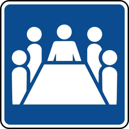 Panneau de signalétique d'information carré blanc sur fond bleu indiquant la présence d'une salle de reunion ou de travail.