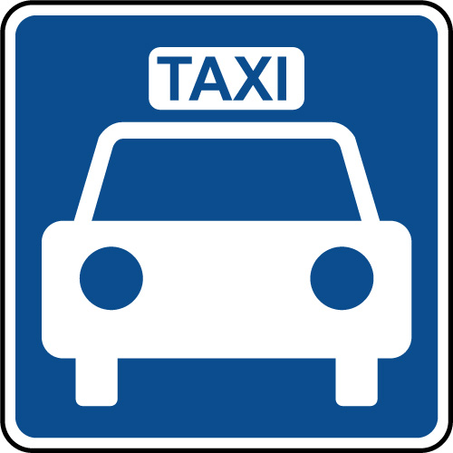 Panneau de signalétique d'information carré blanc sur fond bleu qui indique la présence d'une station de taxi aux voyageurs.