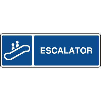 Panneau de signalétique d'information rectangulaire et horizontal blanc sur fond bleu signalant la présence d'un escalator ou d'un escalier roulant.