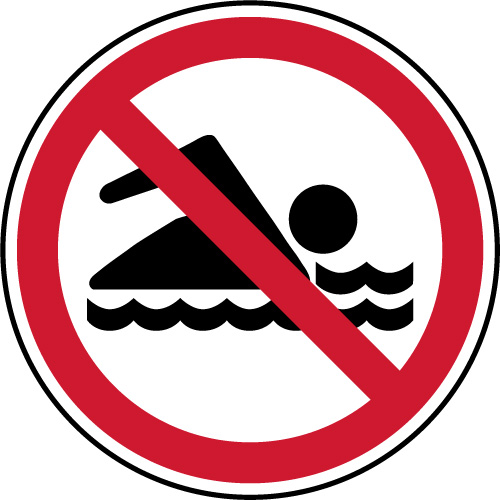 Panneau de signalétique d'interdiction rond fond blanc liseré rouge stipulant qu'il est interdit de se baigner dans ce cours d'eau, pour des raisons de sécurité ou de respect de la biodiversité.