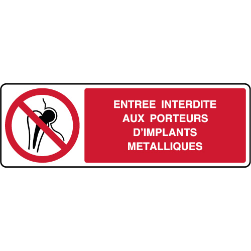 Panneau de signalétique d'interdiction rectangulaire et horizontal fond blanc et rouge permettant d'interdire l'accès aux personnes porteuses d'un ou de plusieurs implants métalliques.