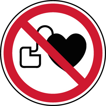 Panneau de signalétique d'interdiction rond fond blanc liseré rouge, pictogramme P007 prohibant l'accès aux personnes porteuses d'un implant ou d'un stimulateur cardiaque dans le but de protéger leur santé.