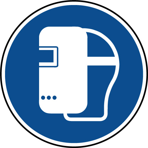 Panneau de signalétique d'obligation rond blanc sur fond bleu avec pictogramme M019 préconisant le port obligatoire d'un masque de soudage.