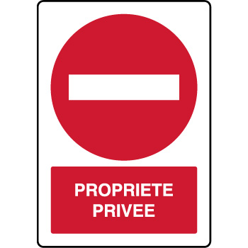 Panneau de signalétique d'interdiction de parking rectangulaire vertical fond blanc liseré rouge, avec texte et logo permettant de signaler une propriété privée interdite à la circulation.