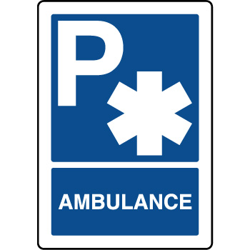 Panneau de signalétique d'indication de parking rectangulaire vertical blanc sur fond bleu avec logo et texte, permettant de signaler un parking réservé aux ambulances.