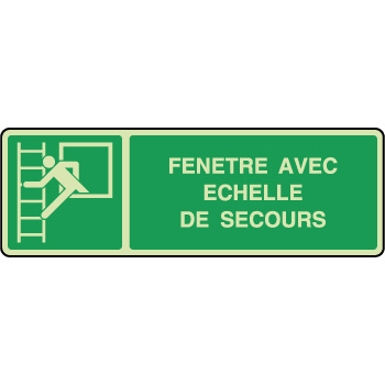 Panneau de signalétique d'évacuation photoluminescent rectangulaire horizontal blanc sur fond vert pour indiquer une fenêtre de secours et échelle de secours en cas d'évacuation d'urgence.
