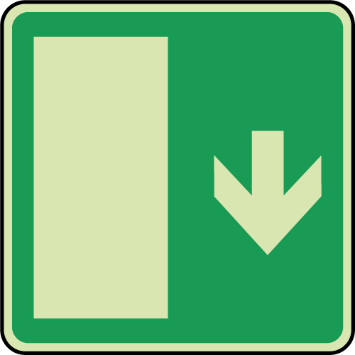 Panneau de signalétique d'évacuation photoluminescent carré blanc sur fond vert pour indiquer une issue de secours située en bas, à utiliser pour faciliter l'intervention des secours.
