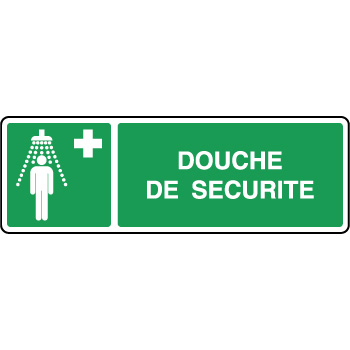 Panneau de signalétique de premiers secours et d'évacuation rectangulaire horizontal blanc sur fond vert permettant de prévenir de la présence d'une douche de sécurité en cas de contact avec des matières dangereuses.
