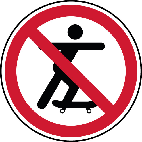 Panneau de signalétique d'interdiction rond fond blanc liseré rouge indiquant que l'usage de planche de skate est formellement interdit.