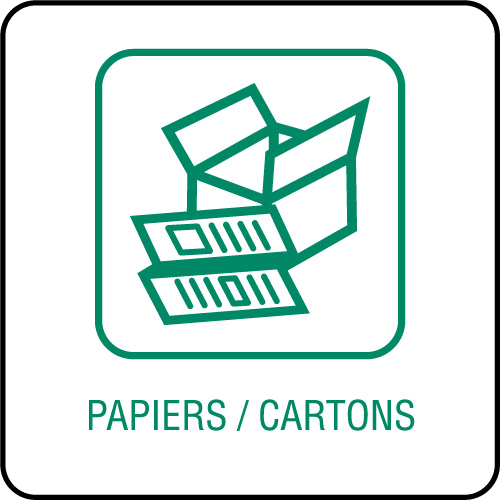 Panneau de signalétique de tri sélectif pour le recyclage en déchetterie, carré blanc et pictogramme vert, permettant d'identifier un conteneur de recyclage pour les papiers et catons.