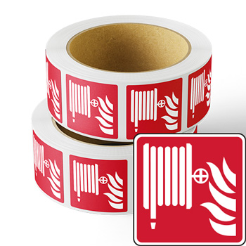 Pictogrammes liés aux consignes incendie, blancs sur fond rouge, en vinyle adhésif. Permet de signaler la présence d'un robinet d'incendie armé (RIA) en cas de départ de feu. Code ISO 7010 F002.