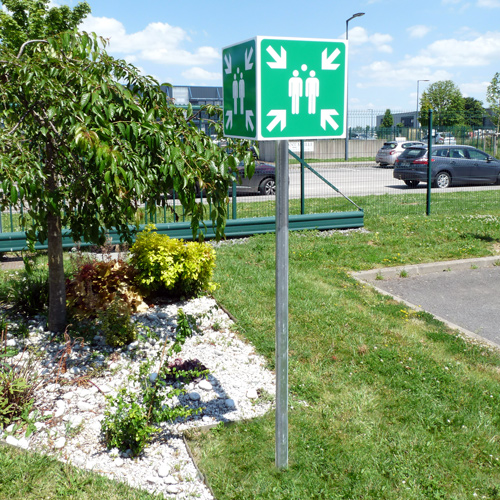 Panneau point de rassemblement avec 4 faces visibles à 360°. Permet de regrouper les personnes d'un bâtiment en cas d'évacuation d'urgence. Face de 400 x 400 mm. En aluminium épaisseur 2 mm laqué blanc. Film adhésif avec protection transparente (laminé). Pictogramme conforme à la norme NF EN ISO 7010. Deux types de film adhésif : classique impression quadrichromie avec film de lamination ou photoluminescent (pour être visible la nuit) avec film de lamination. Livré avec 2 brides de fixation Ø 60 mm. Poteau en acier galvanisé Ø 60 mm de 3 ml fourni (à enfouir sur 0,50 m).