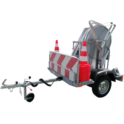 Grâce à son râtelier multifonction, cette remorque permet de transporter efficacement tous les équipements nécessaires à la signalisation temporaire :