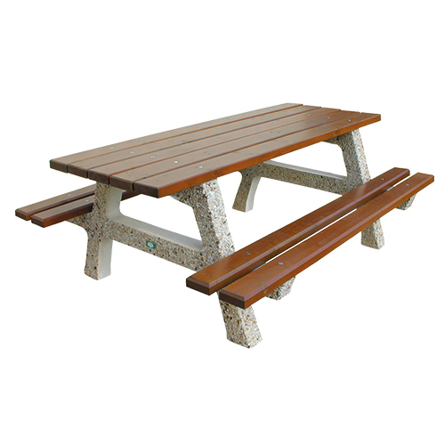Table au design traditionnel qui permettra aux familles de partager un moment de convivialité. Table et assise en bois. Structure en béton armé.